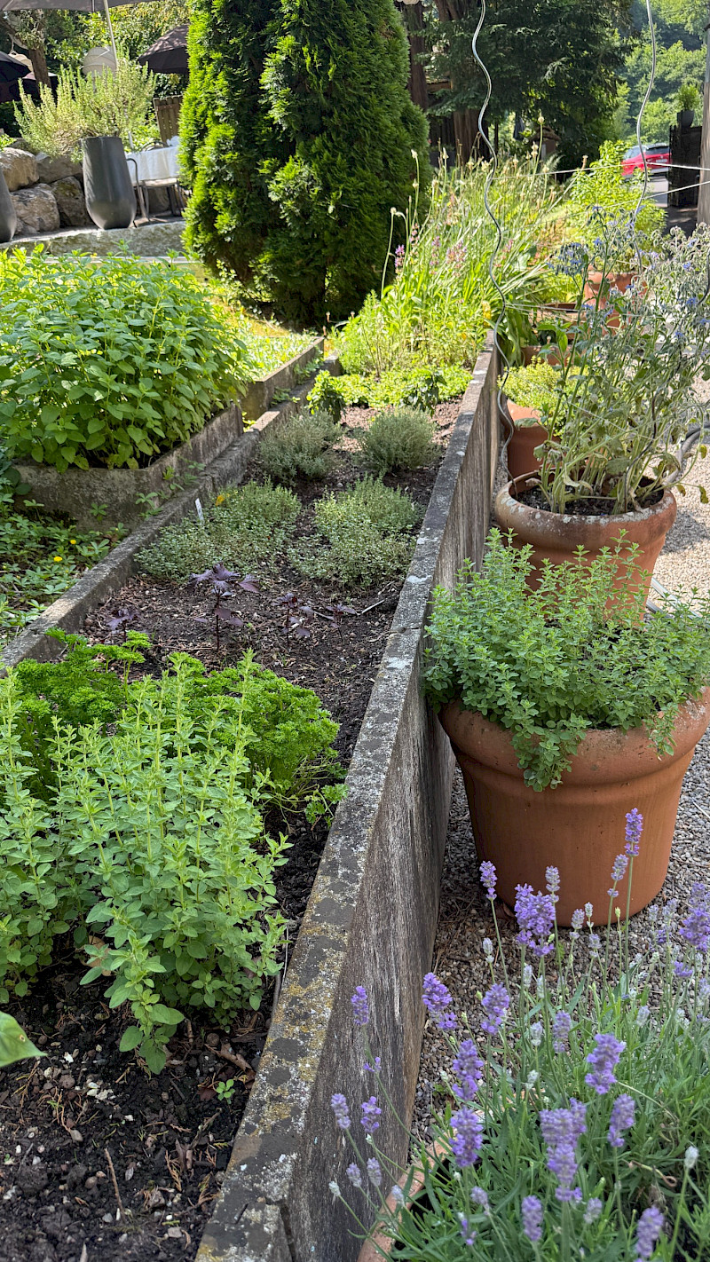 Unser Kräutergarten im Sommer versorgt uns mit frischen Kräutern.